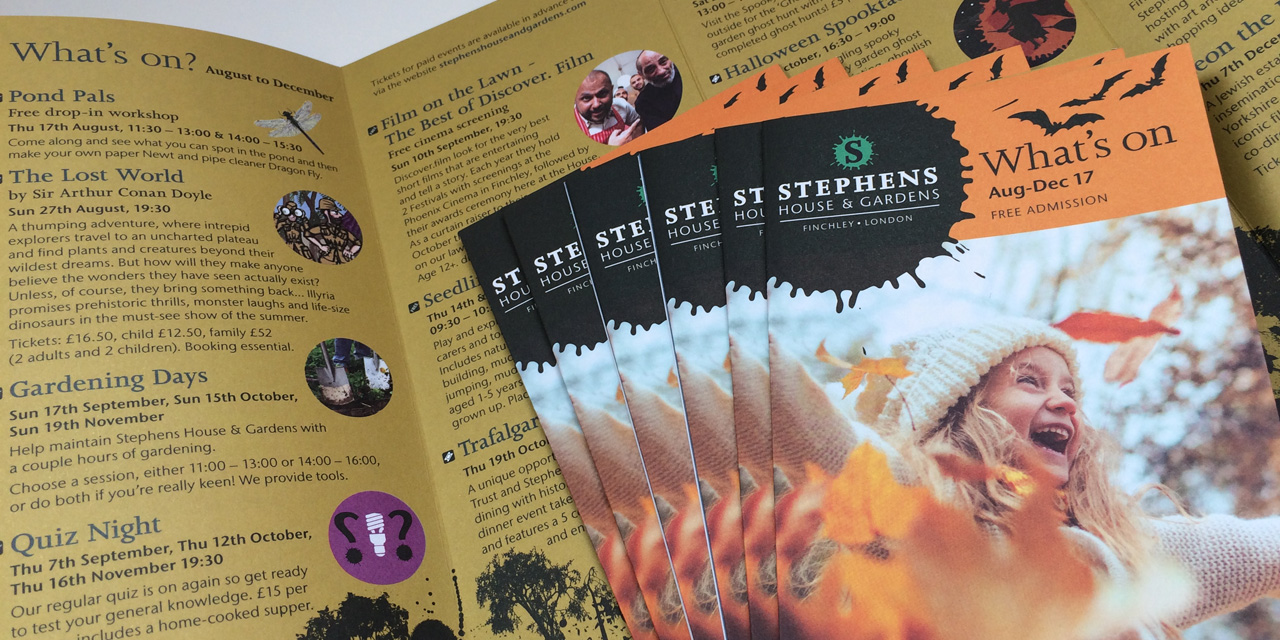 A packed season of events at Stephens House & Gardens means that in it's third iteration the events leaflet has expanded again with another two panels in order to fit it all in! The front cover highlights the gorgeous colours in the gardens at this time of year.